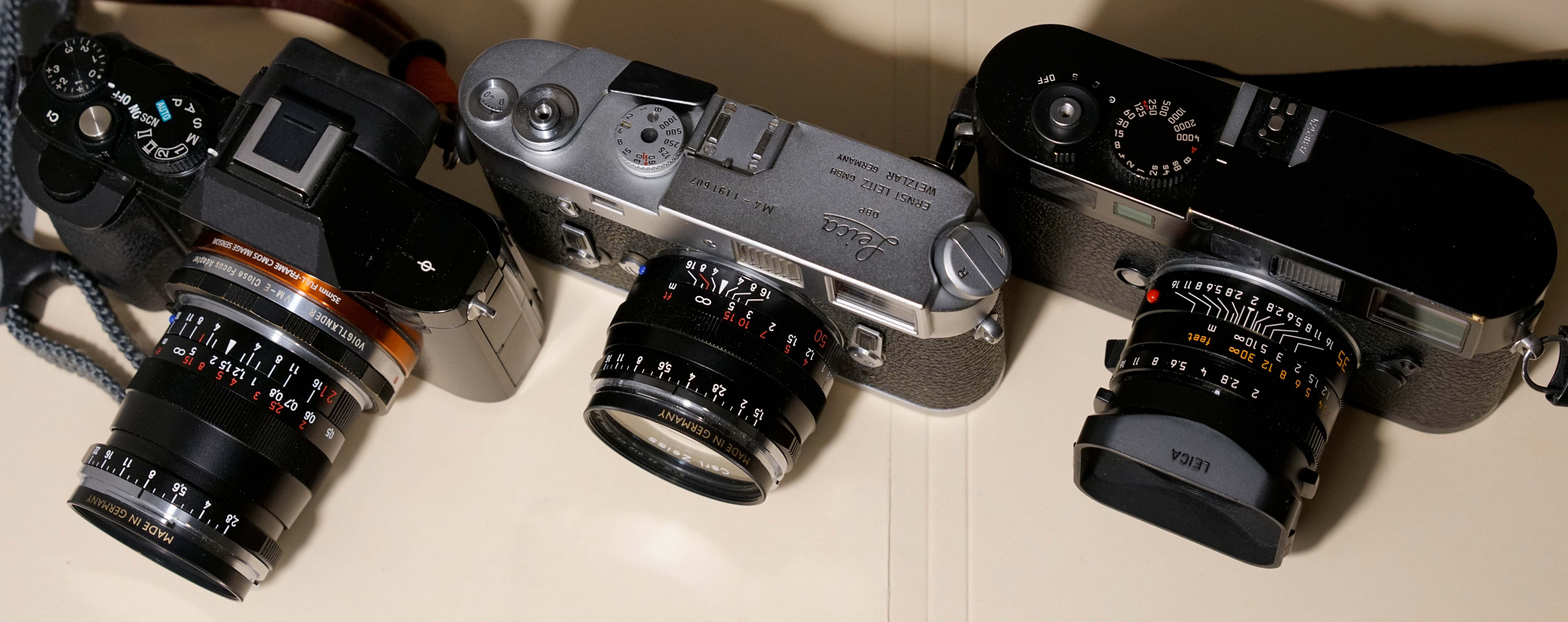 照这个标准,首先选镜头。变焦镜头太长,排除;定焦里,自动对焦头要么太吵要么太粗,也排除;最后符合小巧而又高画质要求的,便是手动对焦的M口镜头了。考察一番,锁定了下面三枚足够小的手动定焦头: